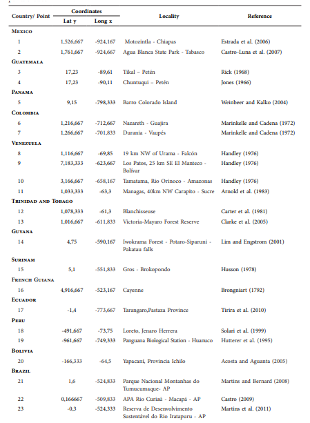 The current known distribution of L. brachyotis ranges throughout southern Mexico, Guatemala, Panama, Colombia, Venezuela, Bolivia, Trinidad and Tobago, Guyana, Suriname, Ecuador, Peru, and Brazil (Weinbeer and Kalko, 2004; Acosta and Aguanta, 2005;Simmons, 2005;Williams and Genoways, [2008]; Tirira et al., 2010). Most of the reports for the species are in Brazil, with records through the Amazon in the states of Acre, Amazonas, Amapá, Mato Grosso, and Pará (Sampaio et al., 2003;Bernard et al., 2011a;Miranda et al., 2015). There are scarce reports for the Atlantic Forest, most of them from the state of São Paulo (Taddei and Pedro, 1996; Gimenez and Ferrarezzi, 2004;Geraldes, 2005), and only one record in each of the following states: Bahia (Faria et al., 2006), Espírito Santo (Peracchi and Albuquerque, 1993), and Paraná (Scultori et al., 2009). Finally, recent reports have mentioned this species to be present in the Cerrado formations of the state of Mato Grosso (Louzada et al., 2015;Oliveira and Faria, 2015)(Fig. 1; Table 1).