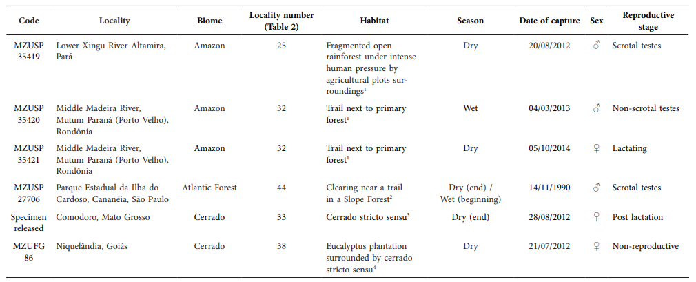 Our specimens include one nonreproductive female, collected in July (from Goiás), one lactating female in October (from Rondônia), and one post-lactating female in August (from Mato Grosso) (Table 2). The literature reports lactating females in July (from Mexico; Estrada et al., 2006), and pregnant and lactating females in July (from Guatemala; Rick, 1968).