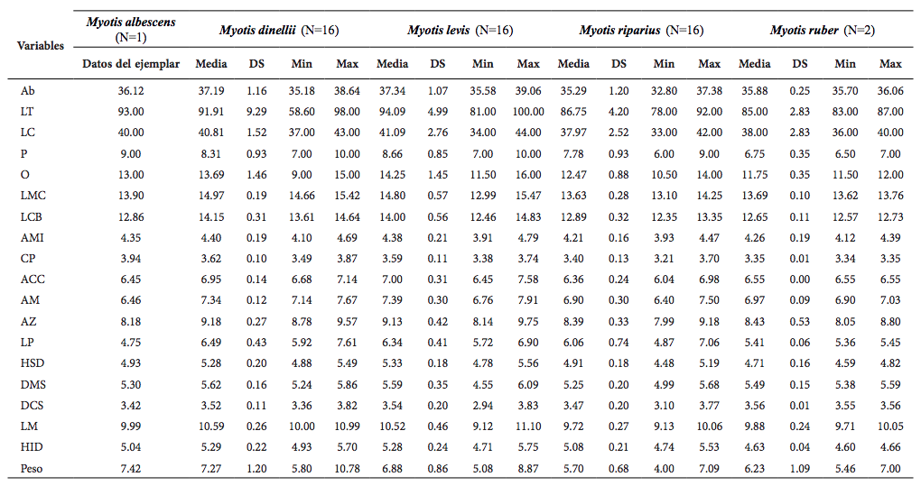 MORATELLI R, AL GARDNER, JA DE OLIVEIRA y DE WILSON. 2013. Review of Myotis (Chiroptera, Vespertilionidae) from Northern South America, including description of a new species. American Museum Novitates 3780:1-36.