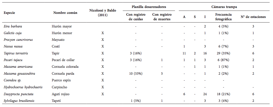 Entre octubre de 2013 y diciembre de 2015 documentamos la caída de 19 especímenes pertenecientes a 5 especies de mamíferos medianos y grandes (Tabla 2). La mayor proporción de individuos correspondió a la corzuela parda (Mazama gouazobira), seguida por el tapir y el pecarí de collar (Pecari tajacu). El gualacate (Euphractus sexcintus) y el tapetí (Sylvilagus brasiliensis) representaron un porcentaje comparativamente menor (Tabla 2). La mayor parte de las caídas de animales (68%) ocurrieron en los meses más secos de primavera (de octubre a noviembre), mientras que en los meses de otoño y los meses de verano-invierno los registros fueron sensiblemente más bajos (21% y 11%, respectivamente). Durante el período de muestreo registramos ocho individuos muertos, la mayoría correspondientes a especímenes de la corzuela parda. Estos datos permitieron estimar un promedio de mortalidad de tres individuos de dos especies por año (Tabla 2). Relevamientos realizados por guardaparques del Parque Nacional Calilegua entre los años 1998 y 2010 dieron como resultado una lista de 19 especies de mamíferos nativos con individuos muertos, la mayoría registradas en los desarenadores 3 y 4 del canal San Lorenzo (Nicolossi y Baldo, 2011). Esta lista se elaboró en base a especímenes principalmente registrados en los “cementerios”, que son zonas ubicadas en las inmediaciones de los desarenadores donde fueron depositados los individuos muertos durante muchos años consecutivos (Tabla 2). Los registros informados por Nicolossi y Baldo (2011) permitieron estimar un promedio de mortalidad de seis individuos de tres especies por año. Estos datos, mayores a los registrados en nuestro estudio, fueron obtenidos con anterioridad a la construcción de las escaleras de escape, lo que podría indicar un efecto positivo de esta medida de mitigación. Sin embargo, estas diferencias podrían deberse a los distintos enfoques metodológicos utilizados y al período de muestreo apreciablemente mayor en el caso del estudio de Nicolossi y Baldo (2011), o a factores biológicos (e.g., cambios en la abundancia de la especie) o físicos (e.g., cambios en la disponibilidad de agua) no tenidos en cuenta en nuestro estudio.