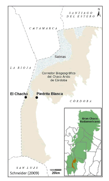 Este estudio se desarrolló en la localidad de Piedrita Blanca y zonas aledañas, ubicadas en el centro del Corredor Biogeográfico del Chaco Árido de la provincia de Córdoba (Argentina). Este corredor (Fig. 1), comprende alrededor de un millón de hectáreas en el oeste de la provincia y abarca ambientes del Distrito Chaqueño (Cabrera 1994).