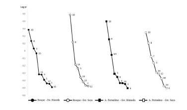 En ambos ambientes y ambas estaciones el ítem consumido con mayor frecuencia fue el denominado aquí “Otras Poaceae”, incluido así en el grupo de las gramíneas dado que representa plantas que no se identificaron a nivel específico, y Geoffroea decorticans, seguidas por diferentes especies según el caso (Fig. 2). Las especies halladas con más frecuencia en la dieta del guanaco, luego de G. decorticans hasta un valor de log10 pi = -0.5, durante todo el año y en ambos ambientes, fueron Atriplex cordobensis Gand. & Stuck. y diversas especies de Prosopis spp.; sumándose “Otros restos” con valores importantes. En estación seca, en ambos ambientes, dominaron hasta ese rango especies de Acacia spp., Alternanthera nodifera (Moq.) Griseb. y Prosopis torquata (Cav ex Lag.) DC. En cambio, en estación húmeda el vegetal abundante en ambos ambientes corresponde a Prosopis alba Griseb.