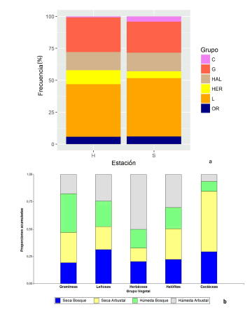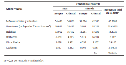 Finalmente, al analizar la frecuencia relativa de las formas de vida de las especies incluidas en la dieta se observó que las leñosas son las más consumidas, seguidas de gramíneas y halófitas (Tabla 3). Todos los grupos vegetales estuvieron presentes en ambas estaciones y ambientes analizados. Las halófitas fueron consumidas en proporciones similares tanto en estación seca como en estación húmeda (Figs. 3a y b); similar a lo observado en la ingesta de leñosas y gramíneas, representando un consumo anual uniforme entre estaciones. Las herbáceas aparecieron con mayor frecuencia en las heces de estación húmeda y, por el contrario, las cactáceas fueron consumidas principalmente en la dieta de estación seca, en ambos ecosistemas.