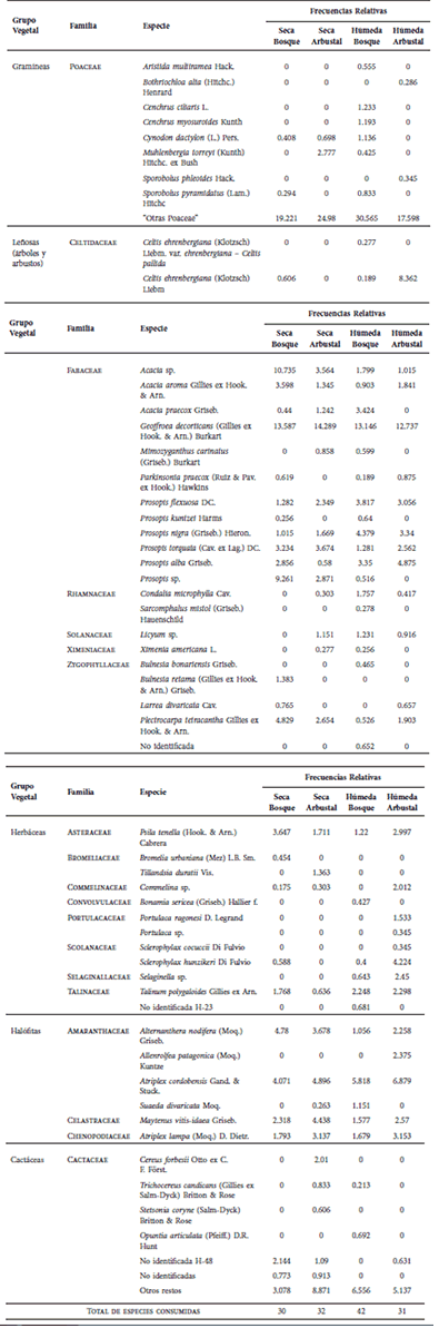 En cuanto a la composición de la dieta, en la estación húmeda, dentro del ambiente boscoso se observó la mayor riqueza (N = 42 spp); en el resto de los casos la riqueza de especies fue similar (N = 30, 31 y 32) (Tabla 1). En todos los bosteaderos, se encontraron especies correspondientes a los dos ambientes (bosque de llanura y arbustal perisalino), lo que sugiere que el guanaco transita ambos ecosistemas.