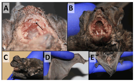 We observed the known characteristics of the species P. davisoni (Gregorin & Taddei 2002; Diaz et al. 2016) from the individual brought to ISP: upper incisors pointed, curved and separated at the tip (Fig. 4A); palate markedly deep; minute, hard, and spoon-like hairs under the nostrils, resulting in a distinctive area (Fig. 4B); very convex rostrum and oval and detached antitragus from lower border of the ear (Fig. 4C); presence of fur at the base of the fifth metacarpal (Fig. 4D); and long calcars that arrives almost until the tip of the tail (Fig. 4E).