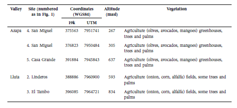 Three survey sites were omitted from the statistical analysis because of marked differences in spatial structure compared to the other sites. The omitted sites were more closed by buildings or because they were in a ravine. Otherwise, the studied sites in Chile and Peru were comparable agricultural or open urban spaces. Bats adjust call parameters according to the structure of the surroundings (Barclay et al. 1999; Gillam et al. 2009); in particular, closed sites result in higher peak frequencies that allow bats to better detect obstacles in the environment.