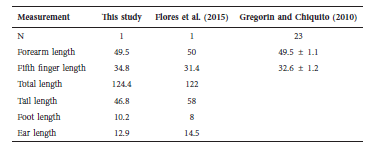 This study was financed by the University of Tarapacá (Undergraduate grants 4713-15 and 4715-16, and UTA Mayor 4710-15). We would like to thank SAG Arica and Parinacota region for providing authorization to capture bats (Resolución Exenta N°7547/2015); Nicole Alvarez for her help during the field work; Michelle Lineros and Tania Gatica from the ISP for their help to obtain and analyze the captured individual; Dr. Renato Gregorin for his help to identify the individual and to the editor Dr. Guillermo D’Elía, the reviewer Dr. Luis F. Aguirre and one anonymous reviewer for their input on a previous version of this work.