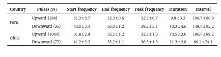Here, we present the first record of Promops davisoni in Chile, increasing the bat fauna of the country to 14 species. Despite the capture effort using mist nets, we did not capture any bat species other than those already reported for the region. We obtained 284 echolocation pulses from a known roost of P. davisoni from Tacna, Peru, and 1044 echolocation pulses from individuals recorded in Chile. We analysed the Peruvian recordings of P. davisoni to obtain the echolocation parameter values of the species. P. davisoni emits two different pulses, upward and downward (Fig. 2, Table 3). The most common pulses are upward, with start frequency of 31.3 ± 0.7 kHz; end frequency of 32.3 ± 0.6 kHz; peak frequency of 32.2 ± 0.7 kHz; duration of the calls of 9.8 ± 3.3 ms; and interval between pulses of 196.7 ± 80.9 ms for recordings obtained in Peru (n = 36); and start frequency of 31.8 ± 2.9 kHz; end frequency of 32.5 ± 1.2 kHz; peak frequency of 32.2 ± 1.5 kHz; duration of the calls of 10.5 ± 3.0 ms; and interval between pulses of 196.7 ± 99.2 ms for recordings obtained in Chile (n = 305) (Table 3). An RDA model explaining the echolocation variables with country of origin was significant (P < 0.001, tested with 999 permutations), even though the difference was relatively small; the RDA-axis accounted only for 1.6% of the total variance (Fig. 3). However, this estimate was confounded by non-independent observations from the same localities and individuals. When accounting for the residual dependence structure, the between-country difference no longer remained significant (P = 0.84). While there was a tendency for bats from Peru to have higher maxima (Fig. 3), these differences were also not significant (P = 0.42).