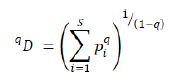 Para estimar la diversidad se calcularon los tres números de Hill (Hill 1973), como una medida de los componentes de la misma (Tuomisto 2010; Moreno et al. 2011). Los números de Hill se obtienen con la fórmula: