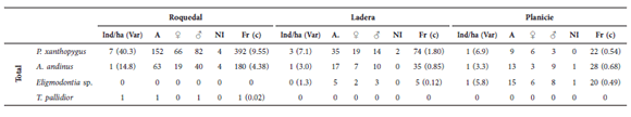 Abundancias de micromamíferos totales para la reserva de Don Carmelo entre los ambientes Roquedal, Ladera y Planicie. Los parámetros calculados fueron, Ind/ha: Individuos por hectárea, (Var) Varianza, A: Abundancia, ♀: hembras, ♂: machos, NI: sexo no identificado Fr: frecuencia de captura, (c): capturabilidad (frecuencia de captura por especie por ambiente/total de noches trampa *100).