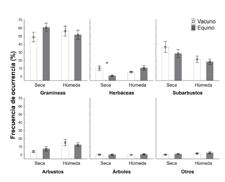 En el área estudiada, caballos y vacas consumen principalmente flora nativa, sobre todo gramíneas predominantes en la zona como Poa sp y Festuca sp. En general, en los ambientes áridos y semiáridos, donde las condiciones son extremas (altas temperaturas, déficit hídrico y baja productividad), las especies responden a la variación estacional y espacial de los recursos (Van Horne et al. 1998). El agua controla por lo tanto el crecimiento vegetativo de la mayoría de las plantas leñosas y la germinación de las hierbas anuales y de las gramíneas (Rundel et al. 2007). La limitación de los recursos ocurre principalmente durante la estación seca, cuando la baja calidad del alimento genera una pérdida de peso en los animales (Danell et al. 2006).