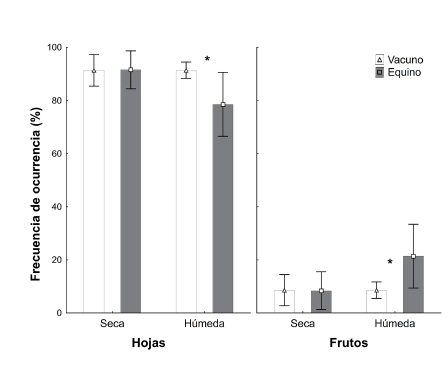 En relación a las partes de las plantas consumidas,durante la estación húmeda las vacas consumieron las hojas en mayor proporción que los caballos (Xvaca= 91.4; Xcaballo= 78.6; U= 18; gl= 1; p=0.015); en cambio los caballos consumieron mayor proporción de frutos que las vacas (Xvaca= 8.6; Xcaballo=21.4; U=18;gl=1; p=0.015; Fig. 2).
