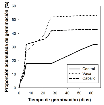 La tasa de germinación para las semillas del control fue casi 4 veces menor que la de las semillas consumidas por los ungulados. Asimismo, las semillas consumidas por caballos demoran más en germinar que las semillas consumidas por las vacas (Tabla 2; Fig. 3).