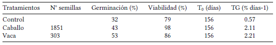 El porcentaje de germinación de las semillas consumidas por las vacas y los caballos fue mayor que el de las semillas del tratamiento (χ2=9.021; gl=2; p<0.05; Tabla 2).
