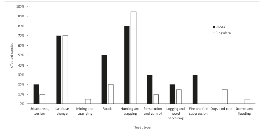 Hunting by humans. The majority of species in both the Cingulata and Pilosa are affected by hunting and trapping (Fig. 2), although the reasons for these pressures differ among taxa. Virtually all armadillo species are used as a protein source (Kennerley et al. 2018). The impacts of subsistence hunting may be increasing in areas subject to forest fragmentation because the latter facilitates access to previously undisturbed areas and the associated populations of armadillos (Peres 2001). Hunt ing pressure on small-bodied armadillo species may also be increasing due to the reduction of alternative, larger-bodied game species (Peres 2000). Further, a shift from subsistence to commercial armadillo hunting has been observed in regions such as the Llanos of Colombia, where changes in the demography of human populations have created a market for xenarthran meat (Superina et al. 2014d). The impact of these changes in hunting pressures on wild armadillo populations needs to be carefully assessed, after which appropriate mitigation measures can be identified and implemented (see e.g. Superina et al. 2014d, 2019).