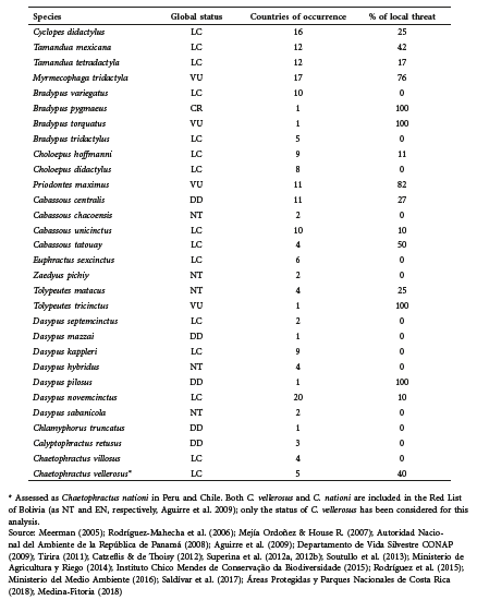 Due to these challenges, we limited our analyses to species assigned to a threatened category (Vulnerable, Endangered, Critically Endangered, threatened, fully protected by na- tional law) at either the national or global level. We calculated the percentage of all countries in which the species occurs and is currently listed as threatened. Our analysis revealed that species that are considered threatened at a global level are also considered threatened in all countries in which they occur (Table 1). For example, the giant armadillo (P. maximus) is listed as Vulnerable in nine out of 11 (81.8%) countries in which it is found (the two non-listed countries do not maintain threatened species lists) and is regionally extinct in Uruguay. Similarly, the giant anteater (M. tridactyla), which occurs in 17 countries, is listed as threatened in 13 (76.5%), and is regionally extinct in El Salvador and Belize.