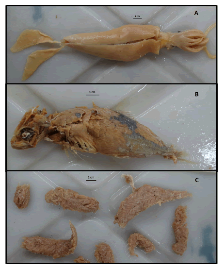 Los estómoagos fueron extraídos completos desde el final del esófago hasta el duodeno y conservados en freezer - 20ºC hasta su análisis. El contenido fue filtrado con malla 0.5 milímetros. El contenido estomacal fresco, luego de analizado fue fijado en formol 10%v/v, mientras que los restos duros fueron conservados en seco en el caso de los otolitos de peces; y alcohol 96%v/v las mandíbulas de los moluscos cefalópodos. Para el objetivo planteado en este trabajo, todos los animales fueron seleccionados del área marina comprendida entre San Clemente del Tuyú (36°21’ S, 56°43’ O) y Mar del Plata (38°00’ S,57°33’ O), zona denominada FMA IVb (Cunha et al. 2014), que corresponde al sector marino norte de la provincia de Buenos Aires, Argentina. La dieta fue analizada de forma separada para los restos duros (Dieta Restos Duros o DRD) y, para las presas frescas (Dieta Presas Frescas o DPF). Para este último método se utilizaron presas con poca o nula digestión que pudieran ser cuantificadas, pudiera medirse su tamaño (largo estándar en cm.) y su peso (en gr.); y también presas completas con leve digestión las cuales sólo permitieron ser cuantificadas (Fig 1A y 1B respectivamente). Las presas con digestión intermedia (ej. Esqueleto axial de peces óseos con restos de musculatura) fueron descartadas del análisis (Fig 1C). Para ambas dietas (DRD y DPF) fueron calculados los índices comúnmente utilizados en estudios de ecología trófica en la especie (Rodríguez et al. 2002; Bassoi 2005; Paso-Viola et al. 2014; Denuncio et al. 2017): Frecuencia de Ocurrencia Porcentual: FO%, porcentaje en que la presa/taxón se encuentra respecto al total de muestras analizadas.
