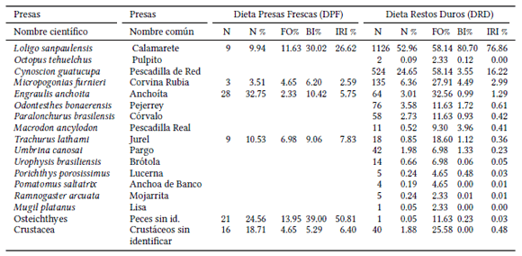 En el análisis de DRD, la presa más importante según los valores de IRI%fue el calamarete Loligo sanpaulensis (IRI%= 76.99), seguido por pescadilla de red Cynoscion guatucupa (16.24%), corvina rubia Micropogonias furnieri (3.00%) y anchoíta Engraulis anchoita (1.29%). Estas cuatro especies estuvieron presentes (Frecuencia de Ocurrencia o FO%) en más del 27%de los estómagos analizados por este método (Tabla 1).
