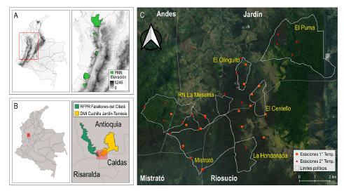 El área de estudio comprende bosques andinos ubicados en la cordillera occidental entre los departamentos de Antioquia, Caldas y Risaralda (5°29’58.45"N 75°55’02.62"W– 5°32’23.59"N 75°49’38.21"W). Los bosques monitoreados abarcan un gradiente altitudinal entre 1 800 y 3 000 metros sobre el nivel del mar (m s.n.m.), incluyendo bosque montano y bosque montano alto (Marcelo-Peña & Rodriguez 2014). Estos bosques corresponden a las áreas protegidas por la Reserva Natural (RN) Mesenia-Paramillo (678 ha), El Olinguito (146.5 ha), y El Puma (700 ha), propiedad de la Fundación Colibrí, y la RN El Centello (160 ha) propiedad del Jardín Botánico de Medellín, todas ellas ubicadas en los municipios de Jardín y Andes (Antioquia). Así mismo, se tuvo acceso a predios cercanos a la RN Mesenia-Paramillo, abarcando territorio en los municipios de Mistrató (818 ha, Risaralda) y en Riosucio (Caldas) conectando con La Hondonada (235 ha), otro predio en conservación de la Fundación Colibrí. La elección de los predios externos a los administrados por la Fundación Colibrí se debe a que poseen áreas continuas de bosque con las áreas protegidas (Fig. 1C).