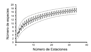 Con el fin de determinar la completitud del muestreo, de forma general para el área de estudio, se emplearon los registros obtenidos en ambas temporadas para construir una curva de acumulación basada en el número de especies con el estimador Mao Tao (Sobs) (Colwell et al. 2004) y para estimar la riqueza esperada de especies, se calcularon algunos estimadores de riqueza basados en la incidencia de especies (ICE, Jack1, Chao2). Ambos análisis se realizaron con el software EstimateS (Colwell 2013) y se empleó el número de estaciones de fototrampeo como medida del esfuerzo de muestreo. Adicionalmente, se construyó un listado de especies de mamíferos que potencialmente podrían ocurrir en la zona y se comparó con los registros obtenidos, para evaluar la completitud del inventario de especies. Este listado fue construido empleando los rangos altitudinales del área de estudio, las listas de mamíferos reportados para Colombia (Solari et al. 2013; Ramírez-Chaves et al. 2016) y los mapas de distribución de las especies de la Unión Internacional para la Conservación de la Naturaleza-UICN (IUCN 2019). Se utilizó como criterio adicional, que las especies pudieran ser registradas e identificadas correctamente mediante fototrampeo.