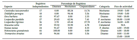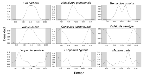 De las 16 especies de mamíferos, sólo nueve fueron registradas de forma independiente más de 10 veces, y por lo tanto sólo se construyeron diagramas de patrones de actividad para estas. Se identificaron tres especies diurnas, una principalmente diurna, dos nocturnas, dos principalmente nocturnas y una catemeral (Tabla 2; Fig. 3). Entre las especies con actividad diurna se encuentran: la taira (Eira barbara) y el cusumbo (Nasuanasua), que presentan un solo pico de actividad que incluye tanto horas de la mañana y de la tarde (Tabla 2; Fig. 3). La ardilla roja (Notosciurus granatensis), por su parte, presenta actividad a lo largo de las horas diurnas, aunque su pico de actividad es mayor en horas previas al mediodía, mientras que el oso de anteojos (Tremarctos ornatus), presenta dos picos de actividad antes y después del mediodía (Tabla 2; Fig. 3). De las especies con actividad nocturna (Tabla 2), la guagua de montaña (Cuniculus taczanowskii) y la zarigüeya de orejas blancas (Didelphis pernigra) presentan un patrón de actividad similar (Tabla 2; Fig. 3). Este patrón se evidencia también en el tigrillo lanudo (Leopardus tigrinus), con más actividad en el crepúsculo que las especies anteriores (Tabla 2; Fig. 3). En el caso del ocelote (L. pardalis), sus picos de actividad se extienden más allá del amanecer (Tabla 2; Fig. 3). Finalmente, el venado (Mazama zetta) tiene un mayor pico de actividad cerca al anochecer, con otros picos de actividad identificados a lo largo de todo el día (Fig. 3).
