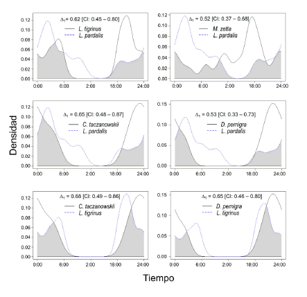 De estas nueve especies, se seleccionaron cuatro para el análisis de superposición de patrones. Los dos felinos del género Leopardus, pues debido a su dieta estrictamente carnívora pueden competir por los recursos alimenticios (Silva-Pereira et al. 2011) y adicionalmente, por la posible depredación de L. tigrinus por parte de L. pardalis (de Oliveira & Pereira 2014). Además, se compararon los patrones de actividad de estos felinos con dos de sus presas potenciales, la guagua (C. taczanowskii) y la zarigüeya de orejas blancas (D. pernigra). También se comparó el patrón de actividad del venado (M. zetta) con el del ocelote, pues se ha reportado previamente que venados de este género pueden ser parte de su dieta (Bianchi et al. 2014). Las especies diurnas no fueron consideradas, pues al ser diurnas ya es claro que existe una segregación temporal con las especies nocturnas. Además, entre las especies diurnas no se realizaron comparaciones debido a que no se identificaron interacciones evidentes como en el caso de las especies nocturnas. Para todas las comparaciones fue usado el estimador “Dhat1” (∆1 sugerido para muestras con menos de 50 registros (Meredith & Ridout 2018), y se determinó que todos los pares de especies comparadas presentan una superposición temporal media (Fig. 4).