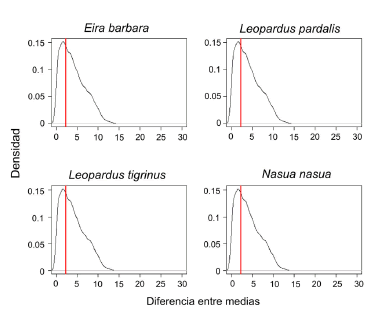 Los resultados del análisis de permutación sugieren que en términos de la tasa de captura las especies de mesocarnívoros seleccionadas no presentan cambios estadísticamente significativos entre las dos temporadas evaluadas en este trabajo (Eira barbara p= 0.8611, Leopardus pardalis p= 0.2597, L. tigrinus p= 0.6932, Nasua nasua p= 0.6559) (Figs. 5 y S1).