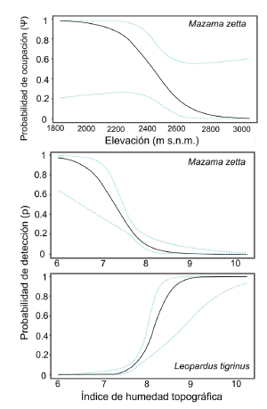 Respecto a los modelos de ocupación también es interesante notar que la probabilidad de detección se vio influenciada de manera significativa por el índice de humedad topográfica en ambas especies, aunque con una relación positiva para oncilla y negativa para el venado. Este índice indica la cantidad de agua que puede acumular un terreno de acuerdo con su topografía (Qin et al. 2011) y se ha demostrado que es un buen predictor para la presencia de especies de plantas y animales (Besnard et al. 2013; Petroselli et al. 2013). Aunque se desconoce el mecanismo mediante el cual esta variable influencia la probabilidad de detección de ambas especies, se podría hipotetizar que la cantidad de agua que se acumulada en un área puede tener efecto sobre el tipo de vegetación presente en la zona, lo que a su vez influencia el desplazamiento y/o forrajeo de los individuos. En cualquier caso, se considera que esta puede ser una variable importante para modelar la probabilidad de ocupación y detección de mamíferos, por lo que se recomienda evaluarla en estudios de ocupación con otras especies y en otros ecosistemas. Así mismo, puede ser importante evaluar el efecto que tiene la presencia de perros en el uso de hábitat del venado y del tigrillo lanudo, considerando estos cánidos como potenciales depredadores de los venados y tal vez competidores potenciales del tigrillo lanudo.