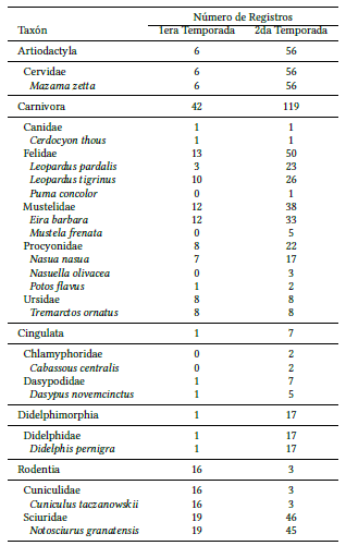 Con la finalidad de determinar si existen cambios significativos entre las dos temporadas de muestreo, relacionados a la conservación de las especies, se evaluó el cambio en la tasa de captura de algunos mesocarnívoros para los que se obtuvo mayor número de registros durante las dos temporadas: ocelote (Leopardus pardalis), tigrillo lanudo (L. tigrinus), taira (Eira barbara) y cusumbo (Nasua nasua). La elección de estas especies también se debe al papel que desempeñan estos mamíferos de porte mediano en la estructuración de las comunidades. Las especies hipercarnívoras como los felinos y la taira, ejercen una regulación “top-down” dentro de la comunidad (Roemer et al. 2009). Por su parte, el cusumbo, con su dieta omnívora, ejerce un papel fundamental en la dispersión de semillas (Alves-Costa & Eterovick 2007), y por lo tanto la regeneración de estos bosques.