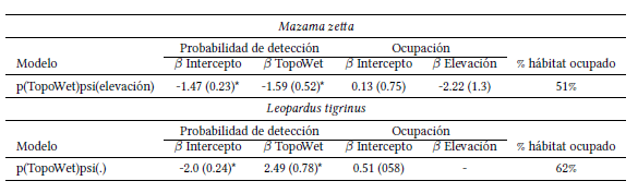 Para estas especies, se realizaron análisis de ocupación para una única temporada, los cuales estiman el porcentaje de área de muestreo ocupada por las especies a la vez que corrigen el sesgo ocasionado por el hecho de que las especies presentan una detección imperfecta (Mackenzie et al. 2006). Dichos modelos permiten además modelar la ocupación (psi) y probabilidad de detección (p) en función de covariables. Estos modelos se desarrollan bajo el supuesto de población cerrada, es decir que no se adicionan o se pierden individuos de la población (sea por migración, nacimientos o muertes), y por lo tanto la ocupación del sitio durante el periodo de muestreo es constante (Mackenzie et al. 2006). Sin embargo, debido a la alta movilidad de L. tigrinus y M. zetta y la temporalidad del muestreo este último supuesto no se cumple, por lo que los resultados del análisis se interpretan como probabilidad de uso de hábitat en lugar de probabilidad de ocupación en sentido estricto (Mackenzie et al. 2006).