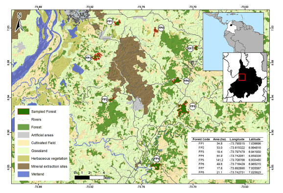 The landscape of study is located in the Middle Magdalena Valley, Santander department, Colombia (central coordinate: 06°59’41.6" N, 73°44’51.5" W, elevation range between 70 and 130 m). The area is classified as Tropical Moist Forest and is characterized by a bimodal rainfall regime with an average annual rainfall of 2 917 mm, a mean annual temperature of 27.9°C, and relative humidity of 80% (IDEAM 2019). Forest patches in the study area are surrounded by a matrix of contrasting characteristics in terms of composition and structure. For this study, we sampled eight forest patches that differ in a variety of ways, including size (17.6 to 141.2 ha), shape, isolation, and fragmentation degree (Fig. 1). It was not possible to select these forest patches randomly owing to insurmountable access difficulties (e.g., large-scale oil palm plantations did not allow us access to their lands).
