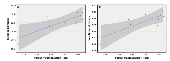 We show that mammal species richness and functional diversity vary according to forest fragmenta tion in a human-dominated landscape. As predicted, we found that species richness and most functional diversity metrics were negatively related to forest fragmentation, but contrary to our expectations they were not related to landscape connectivity. Overall, our results show that mammal assemblages in less fragmented forested areas display a wider array of ecological traits and support a broader spectrum of ecological functions, but are less resilient to environmental perturbations and less resistant to ecological invasions. We discuss the insights arising from this work and consider the implications for management and conservation.