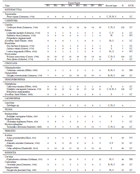 We also installed 16 camera traps (Bushnell Trophy Cam model 119435) in sites presumed to increase the probability of capturing wild mammals (targeted placement), including natural trails, near water bodies, or where signs of mammalian activity were found. The cameras were set up along with terrain conditions to heights between 50 and 70 cm above the ground and were programmed to take either 10- seconds videos (720 x 480) or three photos per trigger (8 mp). Cameras were baited with fruits or a mix of tuna and sardines to increase the likelihood of detection. We assume that images of the same species at the same station within a 1-h period correspond to the same individual. We carried out camera-trapping surveys over an 8-day period during the rainy season (November 2016), using two cameras per forest patches, for a total sampling effort of 128 camera trap days (i.e., 16 trap days per forest patch).