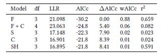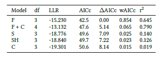 We used beta regression models to evaluate if landscape metrics (i.e., patch size, patch shape, current density, and FAD) explain the variation in functional diversity (response variable). Beta regression is appropriate for dealing with continuous response variables that are restricted between zero and one, as is the case of FDis (Ferrari & Cribari-Neto 2004). We chose FDis for this analysis because it is independent of species richness by construction (see Laliberté & Legendre 2010) so that its use ensures that the number of species does not influence the fit of the resulting models. To avoid multi-collinearity, we evaluated pairwise correlations among explanatory variables using Spearman’s rank correlation coefficients (r). We used log-transformed explanatory variables to improve linearity and reduce data dispersion. Model-averaging started with a global model with all the explanatory variables. Then, we used the dredge() function of the MuMIn package (Barton 2019) to create a set of models with all possible variable combinations, including an intercept-only model, and from these we identified our best models based on comparisons of the second-order Akaike information criterion (AICc). Besides, we calculated the pseudo r2 of the best-ranked models (i.e., the five models with the lowest AICc) as a measure of the models fit.