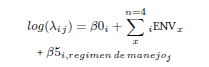 log(rij) = α0i + α1i, distancia a cuerpos de agua x distancia a cuerpos de aguaj + α2i, regimen de manejoj