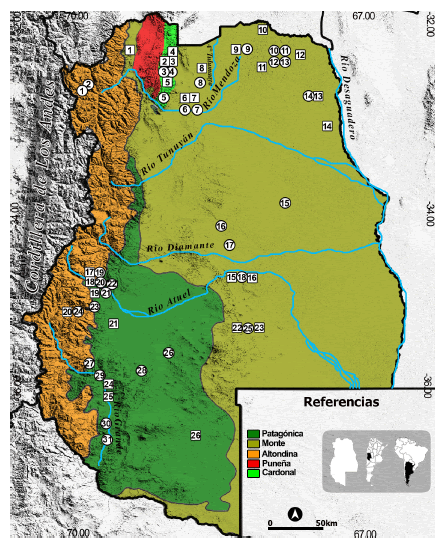 La provincia de Mendoza (Fig. 1) presenta marcadas diferencias altitudinales en sentido oeste-este, con cordones montañosos hasta los casi 7 000 m s.n.m. en el oeste (cordillera y precordillera andinas) y planicies entre los ca. 700-500 m s.n.m. en el este, ambas unidades separadas por una estrecha franja de piedemonte entre los 700 y 1 650 m s.n.m. (Abraham 2000). Esta variación topográfica es consistente con una fuerte variabilidad espacial en cuanto a rasgos climáticos y ecológicos. La franja este de Mendoza está atravesada por la denominada Diagonal Árida Sudamericana, la cual coincide con la unidad biogeográfica del Monte (Abraham et al. 2020). Con base en diversos estudios regionales, se pueden diferenciar cinco unidades fitogeográficas en el área de estudio (Roig 1972, 1994; Cabrera 1976; Roig & Martínez Carretero 1998; Dalmasso et al. 1999; Roig et al. 2009; Oyarzabal et al. 2018).
