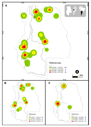 Se utilizó el método kernel mediante el programa ArcGis versión 10.1 (ESRI 2012), para estimar la densidad distribucional de la abundancia de individuos por especie (NMI) de cada muestra, en una unidad espacial como una probabilidad modelada en un mapa. Se realizaron mapas de riqueza y de diversidad (Índice de Diversidad de Shannon), usando un tamaño de grilla de 0.5° en el programa DIVA- GIS versión 7.5 (Hijmans et al. 2012).