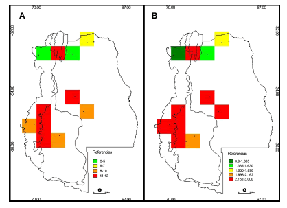 El mapa realizado a partir del programa DIVA-GIS localizó la riqueza taxonómica más baja en la unidad Altoandina, correspondiente a las muestrasde egagrópilas de rapaces indeterminadas del Parque Provincial Aconcagua (Riqueza=3), seguida por el área del piedemonte ocupada por el Gran Mendoza ysus alrededores (Riqueza entre 2 y 5 en muestras de A. cunicularia procedentes de Lunlunta y Laguna de Soria, respectivamente; Fig. 3a). Las áreas ecotonales (Cardonal-Monte-Puna; Altoandina-Patagónica) presentaron los valores más elevados de riqueza y diversidad (Riqueza≥10), así como también algunas áreas del Monte central, la mayoría de ellas coincidentes con la mayor abundancia de NMI. Las muestras actuales generadas por T. furcata exhibieron una riqueza que varió entre 4 (Lunlunta) y 11 (Villavicencio) y valores moderados y altos de diversidad. Así, el índice de diversidad de Shannon osciló entre 0.97 en un área del Monte central (Telteca) y 1.99 en un sector de la unidad Altoandina hacia el SO provincial (Las Leñas; Fig. 3b). La riqueza detectada en muestras de B. magellanicus varió entre 3 (Potrerillos) y 12 (Laguna de la Niña Encantada). No obstante, la diversidad resultó elevada en todas las muestras generadas por esta rapaz. La riqueza registrada en las muestras de A. cunicularia varió entre 2 (Lunlunta) y 6 (Telteca), mientras que la diversidad no excedió el valor máximo de 1.33, detectado en las muestras de Laguna de Soria y de Telteca. La muestra de S. chacoensis (Telteca) presentó una riqueza de 5, mientras que la diversidad resultó elevada (1.3). Respecto a las muestras de aves rapaces diurnas, en aquellas correspondientes a G. melanoleucus la riqueza varió entre 2 (Agua de la Mula) y 9 (Arroyo Malo), mientras que la única muestra de G. polyosoma reveló una riqueza de 5. Respecto a la diversidad detectada en las muestras de este tipo de rapaces, resultó entre 0.66 (Agua de la Mula) y 1.73 (Arroyo Malo).