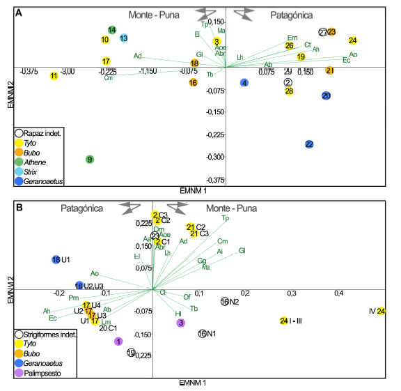 En el EMNM realizado con muestras actuales, ambas coordenadas señalaron un ordenamiento de los conjuntos de micromamíferos coherente con los ambientes que ocupan las especies que los integran (Fig. 5a). Los conjuntos asociados al Monte se ubicaron en los valores negativos del eje 1 y positivos del eje 2. En una posición opuesta se situaron las muestras vinculadas a las unidades Altoandina-Patagónica. Los conjuntos del Monte, mayoritariamente integrados por el sigmodontino oportunista Calomys musculinus, otros cricétidos como Akodon dolores y Graomys griseoflavus y los caviomorfos Galea leucoblephara y Tympanoctomys barrerae, se mantuvieron constantes a lo largo de la franja oriental de la provincia de Mendoza. La presencia del caviomorfo Abrocoma sp. en los conjuntos de Cardonal-Monte-Puna del noroeste de Mendoza marca una diferencia, aunque menor, con respecto a los conjuntos asociados exclusivamente al Monte. La unidad Patagónica, integrada por los sigmodontinos Abrothrix hirta, Abrothrix olivacea, Euneomys chinchilloides, Loxodontomys micropus, Paynomys macronyx y Reithrodon auritus y el marsupial Lestodelphys halli, estuvo representada solo en el sur de Mendoza. Algunos conjuntos de áreas de mayor altitud presentaron especies distintivas de la unidad Altoandina como Euneomys mordax, en el sur de la provincia y Abrothrix andina, en el extremo norte. Los sigmodontinos Eligmodontia sp., Phyllotis xanthopygus, el caviomorfo Microcavia australis y el marsupial Thylamys pallidior tuvieron registros en la mayor parte de las unidades fitogeográficas, prima facie asociados con ambientes abiertos arbustivos y/o con afloramientos rocosos. Con la excepción de las muestras de las unidades Altoandina y Patagónica acumuladas por Geranoaetus, no se observó un ordenamiento generalizado de los conjuntos acorde al depredador que los generó.
