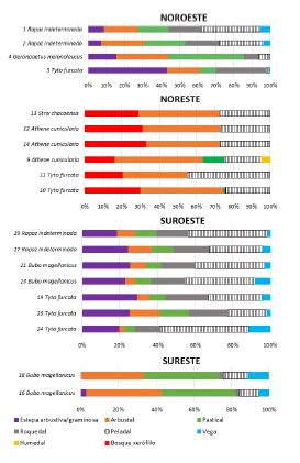 Completan nuestra compilación seis muestras de egagrópilas de rapaces indeterminadas. Espacialmente, las muestras tabuladas representan, aunque en forma irregular, cuatro de las unidades fitogeográficas bajo análisis (i.e., Altoandina, Cardonal, Monte, Patagónica). Tanto depredadores como presas tienen comportamientos, tipos de dieta, distribuciones geográficas y hábitats distintos (Tablas S1 y S2), que serán tenidos en cuenta para hacer comparaciones con muestras fósiles.