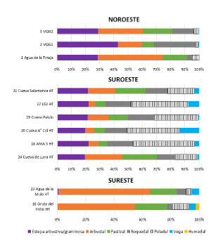 Respecto a las muestras actuales, aquellas correspondientes al área oriental de la provincia (NE y SE) mostraron en su ITH un predominio del arbustal, con porcentajes promedio cercanos al 40%. El SO estuvo integrado mayormente por el peladal (35%), seguido por la estepa arbustivo-graminosa (23%), mientras que el sector NO mostró a la estepa arbustivo-graminosa, al pastizal y al arbustal, con valores promedio similares (ca. 25% cada uno). Por otro lado, en el sector NE también estuvo representado el bosque xerófilo, con un porcentaje promedio de 25% (Fig. 6).