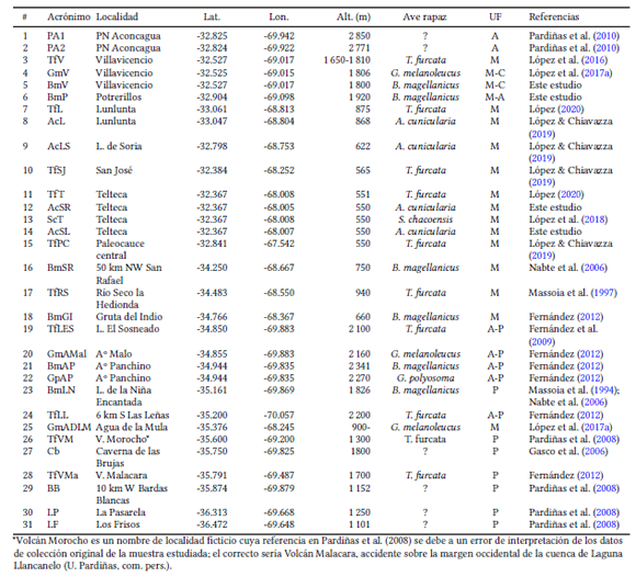 Se tabularon todas las muestras de restos de micromamíferos derivadas del análisis de egagrópilas de aves rapaces disponibles para el territorio de la provincia de Mendoza (n=31), mayoritariamente a partir de datos bibliográficos (Tablas 1 y 2). Estas muestras fueron producidas básicamente por estrigiformes (Tyto furcata [n=10], Bubo magellanicus [n=6], Athene cunicularia [n=4] y Strix chacoensis [n=1]) y, en menor medida, por accipitriformes (Geranoaetus melanoleucus [n=3] y Geranoaetus polyosoma [n=1]) y representan un segmento temporal concentrado en los últimos 34 años.