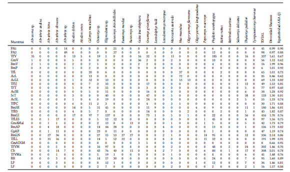Sólo siete muestras actuales y cinco muestras arqueo lógicas presentaron tendencias claramente asintóticas a partir de la riqueza (Figs. S1 y S2), mientras que 19 muestras actuales y 11 arqueológicas presentaron tendencias asintóticas a partir de la diversidad H’.
