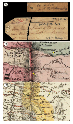 The most parsimonious explanation for the peculiarities described here rests with the actions taken by G. Waterhouse. The holotypes of hirta, macronyx and pontifex are part of a batch of specimens recorded in the NHM catalogue page for 1860 (Fig. S1). At the top of the page, the specimens were recorded in careful handwriting and with sequential numbers (1 to 41). The first 15 specimens were originally recorded only by genus names (Ctenomys or Mus), material type (skin), under the heading “Presented by G. R. Waterhouse, Esq.” In contrast, specimens 28 to 41 are labeled “Zoological Society s Collection Received from Waterhouse.” This subtle difference, between “presented” and “received” is an indication that the specimens of interest (1 to 15) were entered to the NHM collection in 1860 or shortly after and, until that, they were under the control of G. Waterhouse. Returning to the large, ripped label associated with the pontifex holotype, all of the above evidence suggests that G. Waterhouse is the most likely author. Why FSR has become associated with this specimen remains a mystery but it is possible that Waterhouse received additional information from Bridges that allowed the former to be more specific than the vague “Eastern side of the Andes” repeatedly used by Bridges in his botanical collections (Fig. S3).