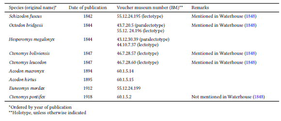 Aconaemys fuscus, presented by Waterhouse in 1841 (but published in 1842, see Duncan 1937), was catalogued in 1855, almost certainly as part of the large set of material transferred from the ZSL to the NHM collections (Thomas 1906:8). However, a paralectotype of Octodon bridgesii, although presented by Waterhouse in 1844 (but published in 1845, see Duncan 1937) was catalogued in 1843, clearly indicating that this specimen was accessioned directly (i.e., received directly from Bridges or via Cuming) into the NHM collections without intermediaries. Indeed, Thomas (1906:23) indicated 1843 as the year for the first accession of a mammal specimen secured by Bridges into the NHM collections. The lectotype for O. bridgesii was catalogued in 1855, at the same time as the lectotype for A. fuscus. For Chelemys megalonyx, a species described by Waterhouse in 1844, the type specimens were catalogued in 1843 and 1844. Therefore, all of these materials likely were originally received by the NHM without having passed through the ZSL collections. The same seems to be true for the two Bolivian Ctenomys, which were published in 1847 and catalogued in 1846 (Table 1). Apparently, the relationship between the year of cataloguing and the year of publication is variable, with no fixed temporal pattern to these events. The common elements behind these species and museum actions are the role of G. Waterhouse and the housing of these materials in the NHM collections beginning in 1843, which coincides with his move to this institution.