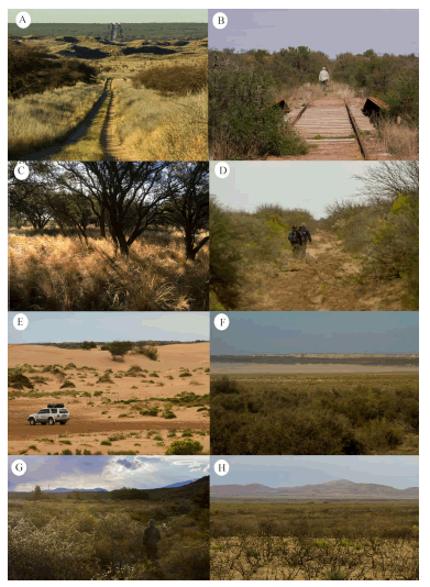 El área muestreada, unos 53 200 km2, incluye las PFE y PFM, que representan el 46% y el 32% de la superficie total de estas unidades en La Pampa, respectivamente, y una pequeña porción de la PFP (Fig. 1). En ellas se registran sectores con escaso impacto antrópico y otros con niveles variables de modificación, debidos al desarrollo agropecuario y cinegético (Viglizzo et al. 2005; Dussart et al. 2011). La PFE está dominada por bosques abiertos con un estrato arbóreo alto (Prosopis spp.) y arbustivo (piquillín, Condalia microphyla; molle, Schinus fasciculatus y chañar, Geoffroea decorticans, entre otros) y por sectores donde domina el estrato herbáceo (Stipa spp., Hyalis argentea), e incluye fisonomías de mesetas y valles, cordones medanosos, salitrales y planicies arenosas (Figs. 1 y 2A-D). La PFM corresponde a una planicie con predominio de aridisoles y posee arbustales abiertos con dominio de jarilla (Larrea spp.) y otros arbustos, como el alpataco (Prosopis alpataco), la chilladora (Chuquiraga erinacea) y el chañar brea (Cercidium praecox), y un estrato herbáceo dominado por Poa spp. y Stipa spp. (Figs. 2E-H). Un pequeño sector central del área de muestreo corresponde a una estepa psamofítica de Sorghastrum pellitum y Elionurus muticus, que caracteriza a la PFP (Oyarzabal et al. 2018).