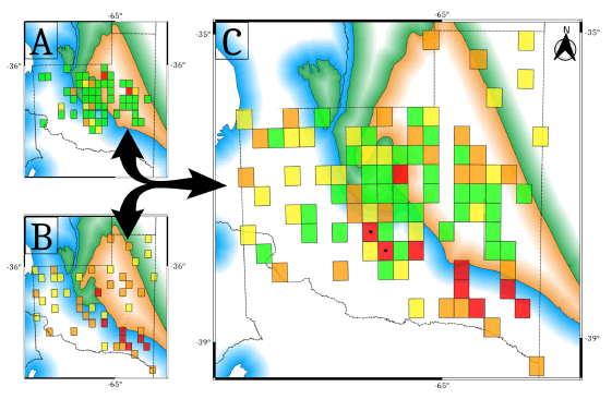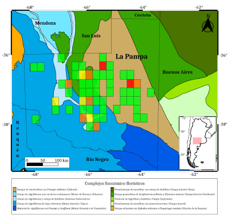 A partir de estos registros generamos 57 cuadrantes con valores de riqueza entre 1 y 14 especies, 25 de los cuales se ubicaron en la PFE, 23 en la PFM y 7 en la PFP; 2 cuadrantes se ubicaron con áreas compartidas entre la PFP y PFE (Fig. 3). Los cuadrantes con mayor riqueza de especies (n=2, con 14 especies registradas) se ubicaron en la PFE, ambos en el complejo fisonómico florístico Bosque de Esclerófitas con Prosopis caldenia, conocido vulgarmente como caldenal (Oyarzabal et al. 2018). Los cuadrantes con una riqueza entre 12 a 9 especies (n=6) se ubicaron en la PFM (n=4), que en la zona de estudio incluye dos unidades fisonómico florísticas: la Estepa de Zigofiláceas y Estepa de Halófitas (Monte A en Tabla 1) y la Estepa de Zigofiláceas de Baja Cobertura (Monte B en Tabla 1), conocidas como Bolsones Endorréicos y Monte Austral o Típico, respectivamente (Oyarzabal et al. 2018); 1 en la PFE y 1 en la PFP, que en la zona de estudio solo incluye la unidad fisonómico florística Estepa Psamofítica de Sorghastrum pellitum y Elionurus muticus, conocida como Pampa Interior Occidental. Los cuadrantes con una riqueza entre 8 a 5 especies (n=4) se ubicaron en la PFM (n=3; con 8, 7 y 6 especies) y en la transición entre la PFE y PFP (con 8 especies). El resto de los cuadrantes, con riqueza entre 4 a 1 especies, se ubicaron mayormente en la PFE (n=22), seguida de la PFM (n=15) y la PFP (n=8) (Fig. 3).