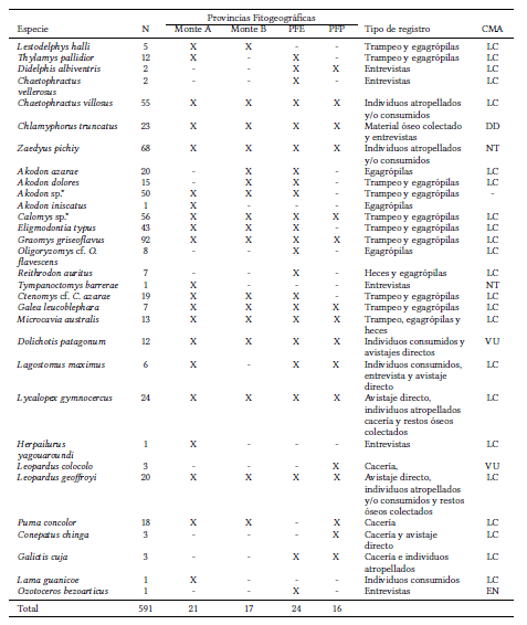 Se recorrieron un total de 4 800 km dentro del área de estudio y se registraron un total de 30 especies de mamíferos terrestres no voladores, incluidas en 26 géneros, 12 familias y 5 órdenes (Tabla 1). No se contabilizaron las 4 especies exóticas asilvestradas de amplia representación local: A. cervicapra, C. elaphus, Lepus europaeus y S. scrofa. Se obtuvieron 591 registros georeferenciados (Tabla 1), entre los que se destacan 123 por observación directa (se incluyen aquí ejemplares hallados muertos y/o atropellados en campos y caminos), 108 registros a partir de trampeo, al menos 230 registros a partir de restos hallados en egagrópilas y heces de carnívoros, 103 a partir de restos hallados en puestos de pobladores y resultado de alimento o cacería (ver APÉNDICE 1 y Discusión). El resto de los registros se reparte entre entrevistas informales (21) y pequeñas colecciones depositadas en escuelas y en el centro de interpretación del Parque Nacional Lihué Calel (6).