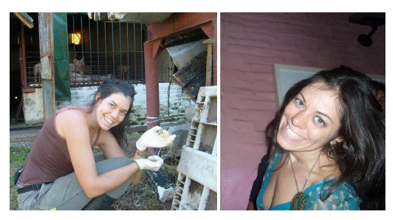 Le encantaba ir de campaña, a pesar de no llevarse muy bien (sobre todo al principio) con la rutina de los guantes de látex y los protocolos de desinfección y manipulación de material biológico, muy probablemente debido a su eterna distracción que la llevaba a dispersarse. Pero claro, todo lo compensaba con creces con su actitud positiva y espíritu trabajador. Así fue como se sumó, ya como tesista de licenciatura dirigida por Regino Cavia (Regi), en muchísimos muestreos, suyos y de otros, siempre firme y alegre, incluso con lluvia, fiebre, y hasta con un brazo enyesado. Y se copó con nosotros, así como nosotros con ella. Su gran voluntad y capacidad de trabajo permitieron que realizara su tesis de licenciatura con la técnica del hilo-tracking, estudiando el uso del espacio y los movimientos de la rata parda en sistemas de cría intensiva animal. Su trabajo de tesis involucró seguir cerca de 100 ratas en sus andanzas diarias dentro de un tambo y un criadero de cerdos, estacionalmente. No era un trabajo fácil, en principio porque era una técnica en la que había que incursionar, que en el labo no se había hecho aún, y sobre todo por el lugar donde se hacía, ya que había que esquivar las actividades de los trabajadores de los tambos y criaderos, además de esquivar bostas, pilas de alimento de chanchos en diversos estados de putrefacción, y sus millones de moscas asociadas. Todo esto implicaba muchas horas de trabajo en el campo, madrugando tempranísimo (3:30 am) para adelantarse al ordeñe, siguiendo hilos de muchísimos metros todos enrollados entre sí, afrontando todo tipo de dificultades en el camino, y lidiando más de una vez con insolaciones, picaduras y dolores de todo tipo. Por supuesto, nunca iba sola. Con Rori eran compañeras inseparables, compinches en el campo y, con el tiempo, íntimas amigas, casi hermanas. También Laura (Lau) Calfayan y Florencia Mallou fueron compañeras de campo en algunos muestreos. Las tres recuerdan esas épocas de mucho campo con Danu como intensamente agotadoras, pero también muy divertidas, plenas de risa, y de las cuales hay mil anécdotas de sus andanzas que guardaremos por siempre. “A cada rato se olvidaba dónde había dejado la llave, pero nunca se olvidaba de lo que le contabas, y recordaba con lujo de detalle las historias de los demás. Y siempre preguntaba cómo iban tus cosas, escuchando con atención cuando lo necesitabas, abrazando y conteniendo a todos los que estuvieran pasando un mal momento”, recuerda Lau. Luciana (Lu) Adduci también recuerda esta calidez de Dani. “No me olvido de la facilidad que tenía para encariñarse con la gente y la naturalidad con la que lo demostraba. . . la admiraba por eso. Era obstinada en sus opiniones, y tenía convicciones firmes. . . pero sin embargo, siempre escuchaba” recuerda Lu. Pero no sólo ellos la acompañaron al campo, varios otros integrantes del labo y voluntarios tuvieron la suerte de compartir campañas y/o congresos con ella. Todos coinciden en que la pasaban muy bien con ella, y que a pesar del cansancio y las condiciones muchas veces inhóspitas, nunca faltaba la diversión y la risa. Sobre todo, eso, la risa. Esa risa de cansancio nomás, o de risa por no llorar ante una camioneta atascada en el barro a las 10 de la noche (después de 17 horas de trabajo, insoladas y con dolor de cabeza), intentando las mil formas de salir de esa situación (y con Dani pretendiendo, al mismo tiempo, salvar a un conejito que había sido levemente lastimado por los perros). Nos reíamos con ella porque tenía algo que no mucha gente tiene y que es la capacidad de reírse de sus propias locuras y “travesuras”. Ya en ese momento mostró lo que le divertía el campo y la vida rural.