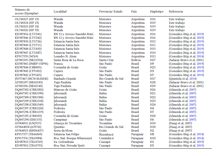 Número de acceso al GenBank de las secuencias utilizadas en la construcción de la red de haplotipos (entre paréntesis se indica el número del ejemplar del cual provienen), detallando la localidad, provincia/estado, país de origen, haplotipo y referencias bibliográficas correspondientes a cada una. Las siglas RN, Ea. y Rva. nat. corresponden a Ruta Nacional, Estancia y Reserva Natural respectivamente.